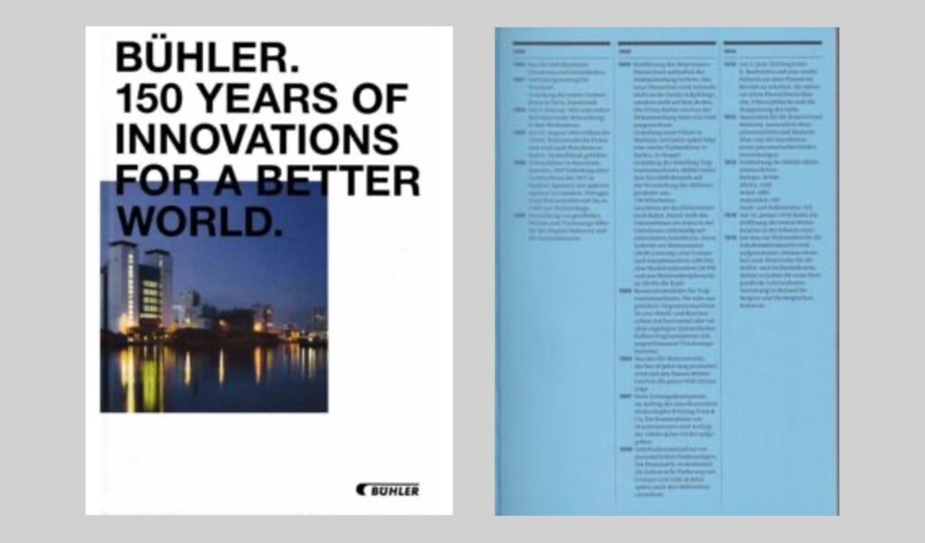 Für den Jubiläumsband «Bühler. 150 Years of Innovations for a better world» habe ich die Firmengeschichte leserfreundlich umgesetzt.